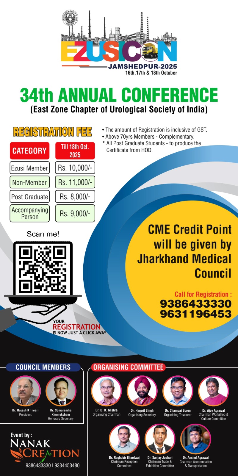 We are delighted to welcome you to Jamshedpur for the Annual Meeting of the East Zone Urological Society of India. This gathering offers a unique opportunity for urologists from across India and around the globe to come together in this vibrant city.